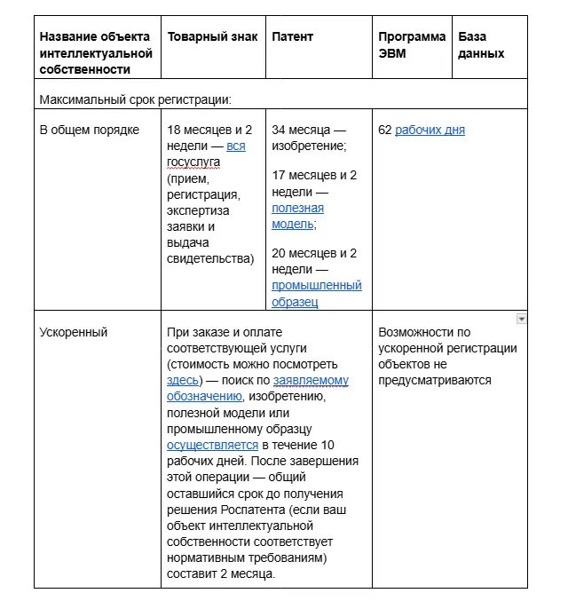 Для указанных объектов интеллектуальной собственности действуют свои правила оформления и сроки регистрации. Разберемся с последними детально.