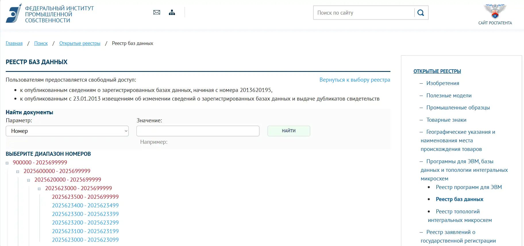 Если решили зайти через главную, то вам предстоит нажать последовательно кнопки «Поиск» — «Открытые реестры» — (после клика и перехода — прокрутить страницу вниз до пункта) «Программы для ЭВМ, базы данных и топологии интегральных микросхем» — выбрать «Реестр баз данных».