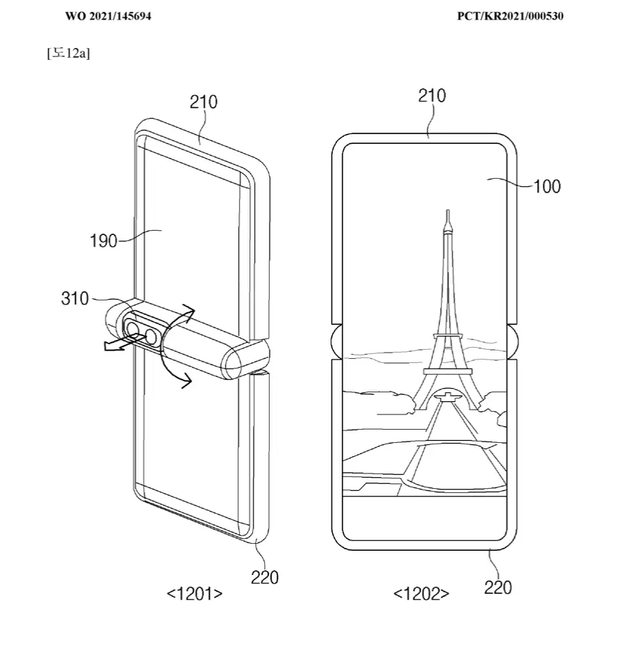 В базе Всемирной организации интеллектуальной собственности (ВОИС) опубликована заявка на выдачу патента от южнокорейской компании Samsung c изображениями складного смартфона, оснащенного вращающейся камерой.